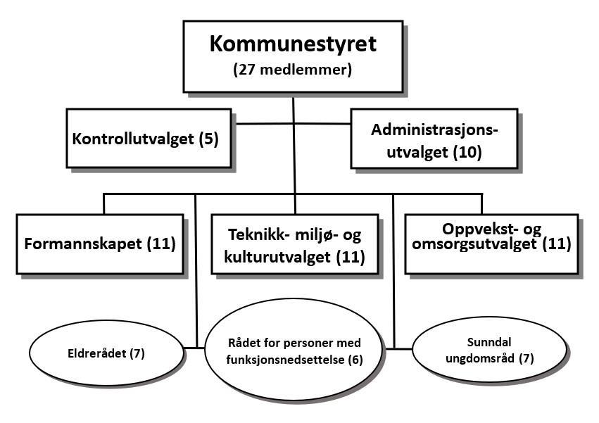 Formannskapet, oppvekst- og omsorgsutvalget og Teknikk-, miljø - og kulturutvalget er likeverdige utvalg med vedtaksmyndighet og innstillingsrett til kommunestyret, alle med 11 representanter.
